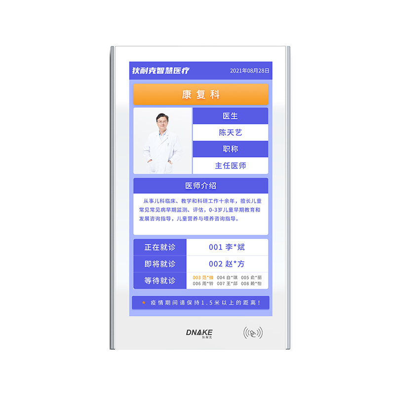每個(gè)診室部署一臺(tái)液晶顯示終端,顯示出診專(zhuān)家(出診專(zhuān)科、健康宣教等)信息,診室叫號(hào)時(shí)全屏(或分屏)顯示需就診患者信息。