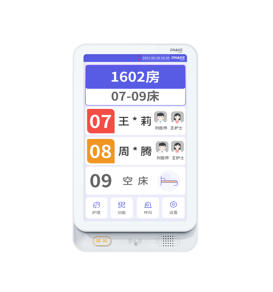 創(chuàng)新設(shè)置在病房門口的終端設(shè)備,主要用于顯示病房相關(guān)信息,內(nèi)置簡易醫(yī)護(hù)工作站,支持病房床位一覽、患者動態(tài)跟蹤、呼叫對講、增援求救等多種呼叫類型,信息齊全,及時響應(yīng)醫(yī)護(hù)需求,實現(xiàn)智能化醫(yī)護(hù)管理。