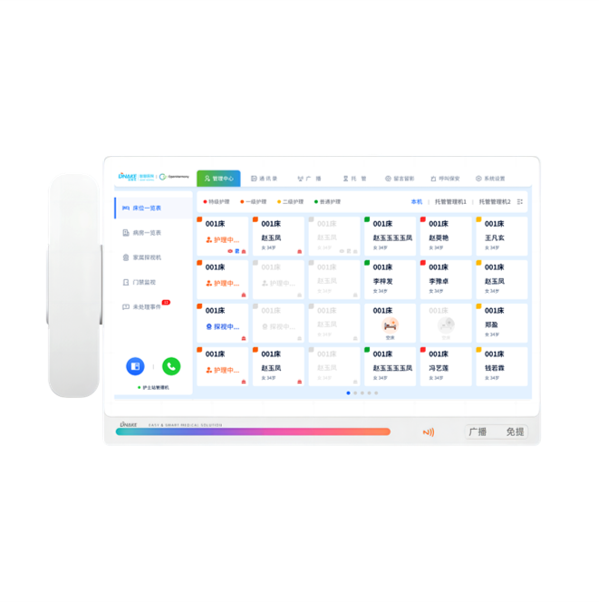 創(chuàng)新設(shè)置在護(hù)士站,可壁掛也可直接放在桌面上。主要接聽病區(qū)內(nèi)病床分機(jī)的呼叫以及患者信息查詢、廣播等基礎(chǔ)應(yīng)用功能,減輕醫(yī)護(hù)人員來回跑動(dòng)的無效勞動(dòng)和壓力,及時(shí)響應(yīng)患者需求,并做好醫(yī)護(hù)信息管理。軟件參數(shù):1)采用多點(diǎn)觸控電容顯示屏操作。每個(gè)觸摸按鈕可以顯示整個(gè)病區(qū)下的,所有病人的名字、性別、護(hù)理等級(jí),點(diǎn)擊格子后,可顯示每張病床患者更具體的患者信息。2)基于TCP/IP網(wǎng)