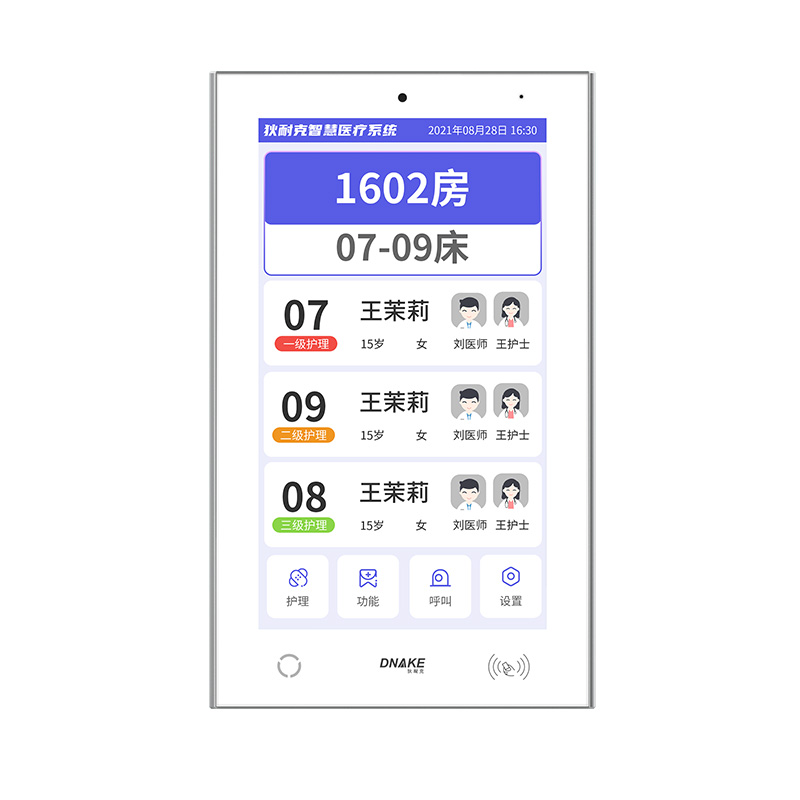 設置在病房門口的終端設備,主要用于顯示病房相關信息,內(nèi)置簡易醫(yī)護工作站,支持病房床位一覽、患者動態(tài)跟蹤、呼叫對講、增援求救等多種呼叫類型,信息齊全,及時響應醫(yī)護需求,實現(xiàn)智能化醫(yī)護管理。