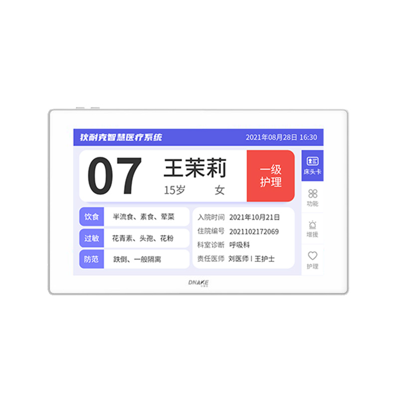 安裝在病床頭的交互設備機,代替?zhèn)鹘y(tǒng)紙質卡。產品支持呼叫對講、為住院患者提供病例查詢、狀態(tài)自動提醒等護理需求等。