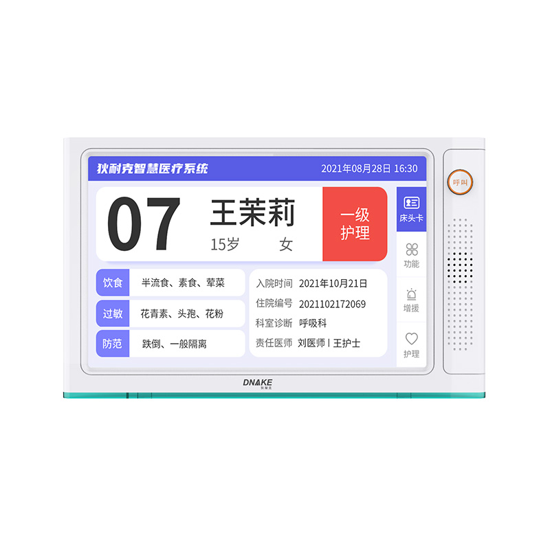 安裝在病床頭的交互設(shè)備機,代替?zhèn)鹘y(tǒng)紙質(zhì)卡。產(chǎn)品支持呼叫對講、為住院患者提供病例查詢、狀態(tài)自動提醒等護理需求等。